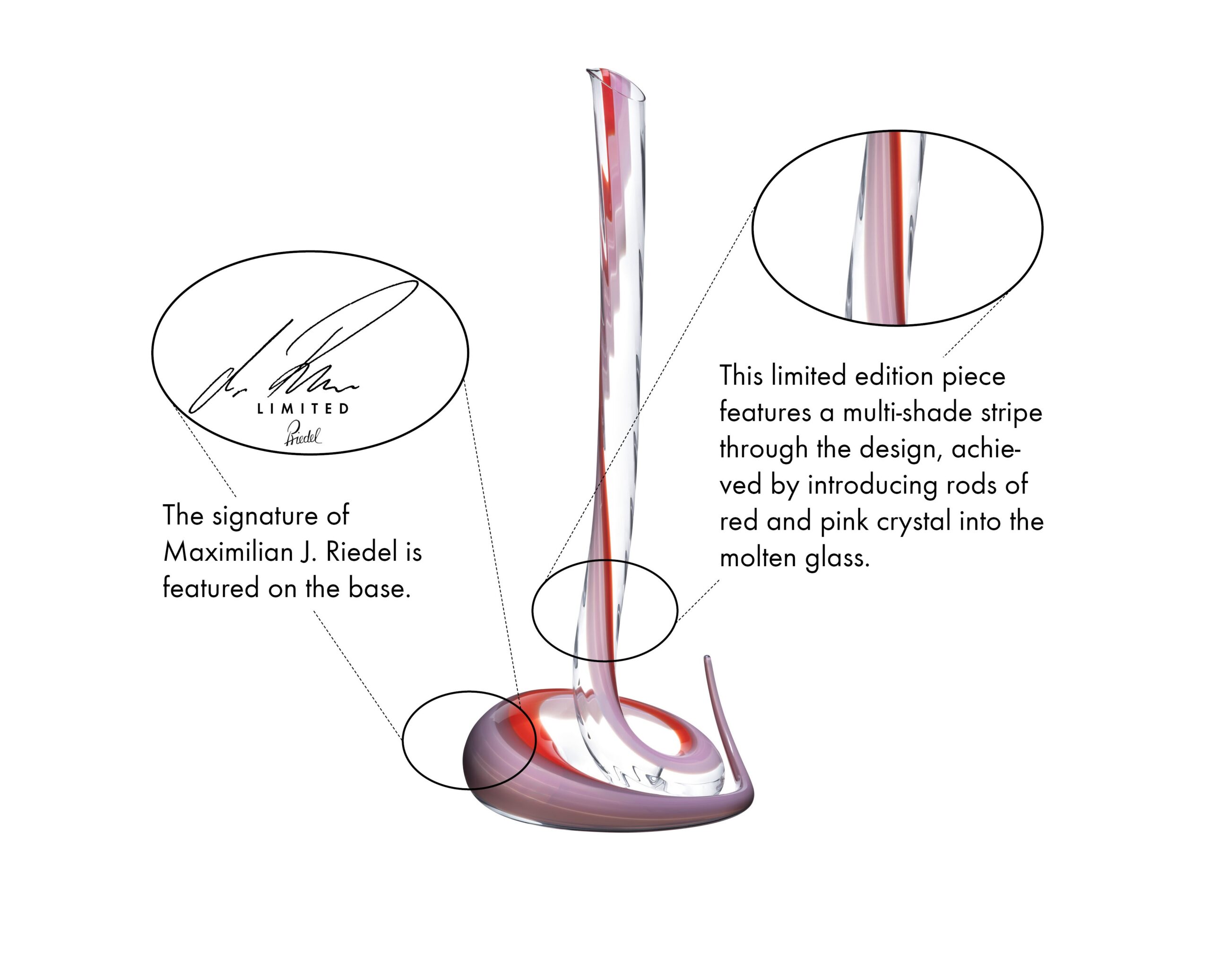 The Cobra Magnum Decanter is a striking evolution of RIEDEL’s iconic Eve, created to deliver theatrical design on a grand scale. Crafted to hold magnum-sized bottles (1.5L), it is both a functional masterpiece and a visual statement. Defined by its Red and Pink multi-shade stripe, each Cobra Magnum Decanter is free blown by a master glass blower, making every piece unique.