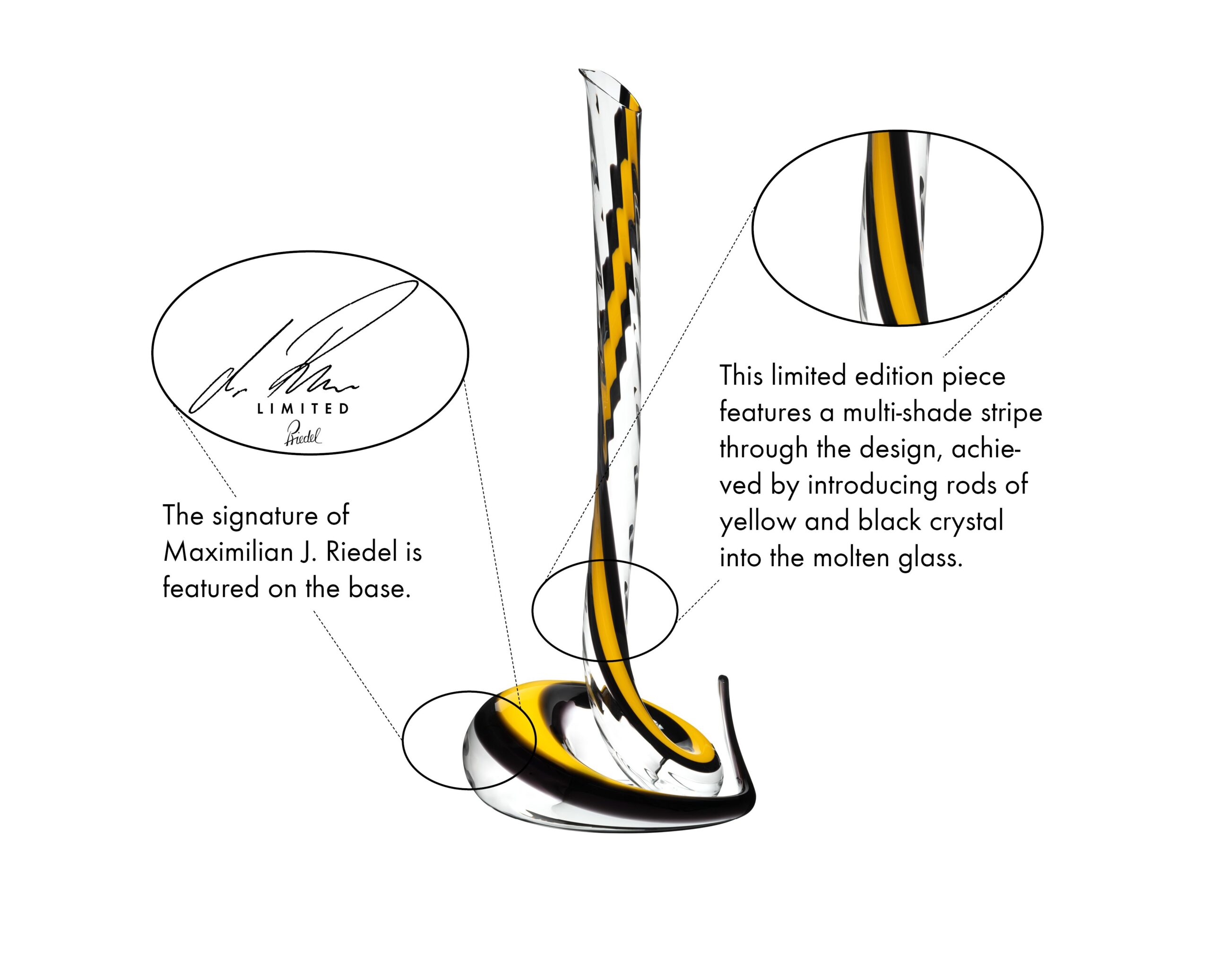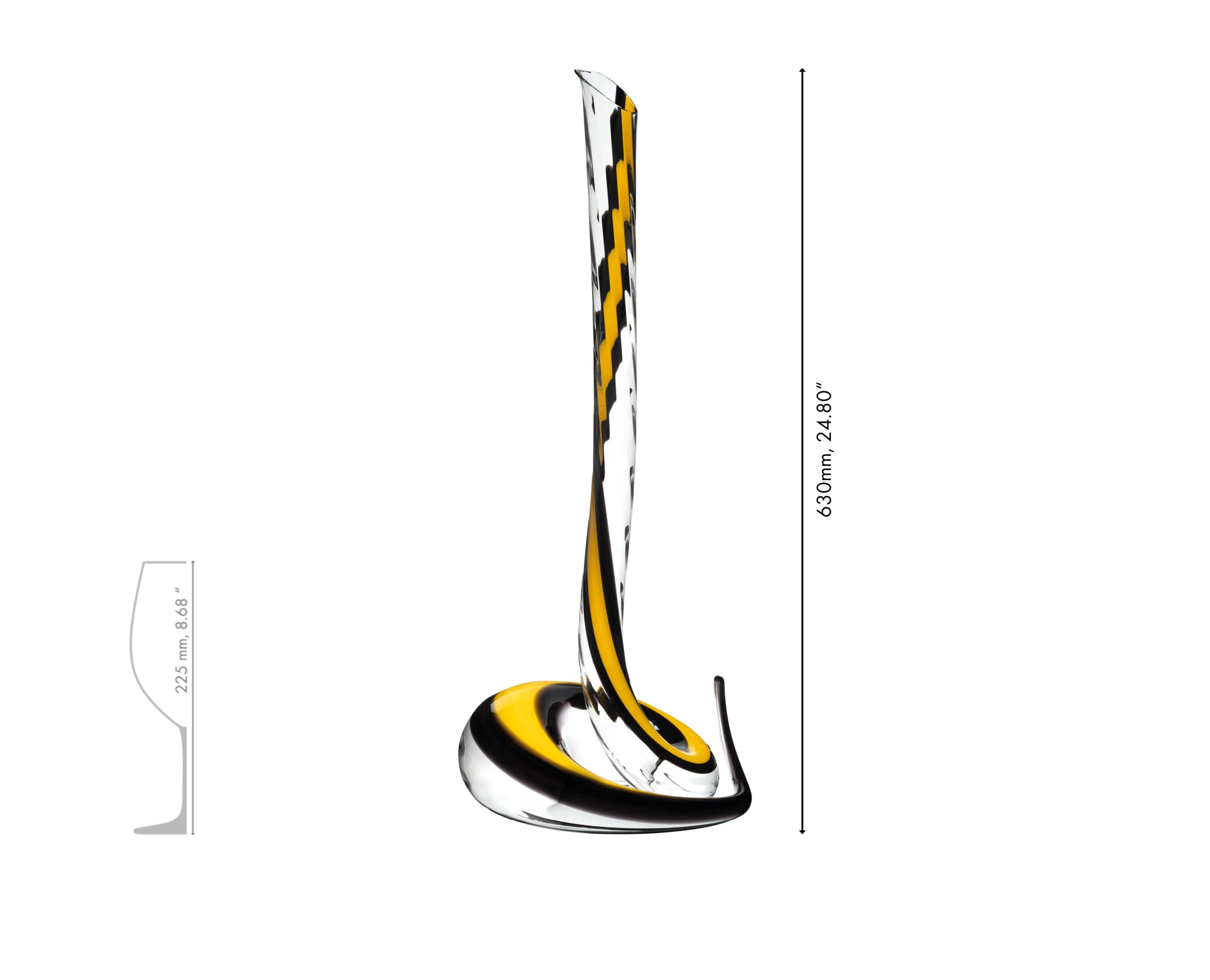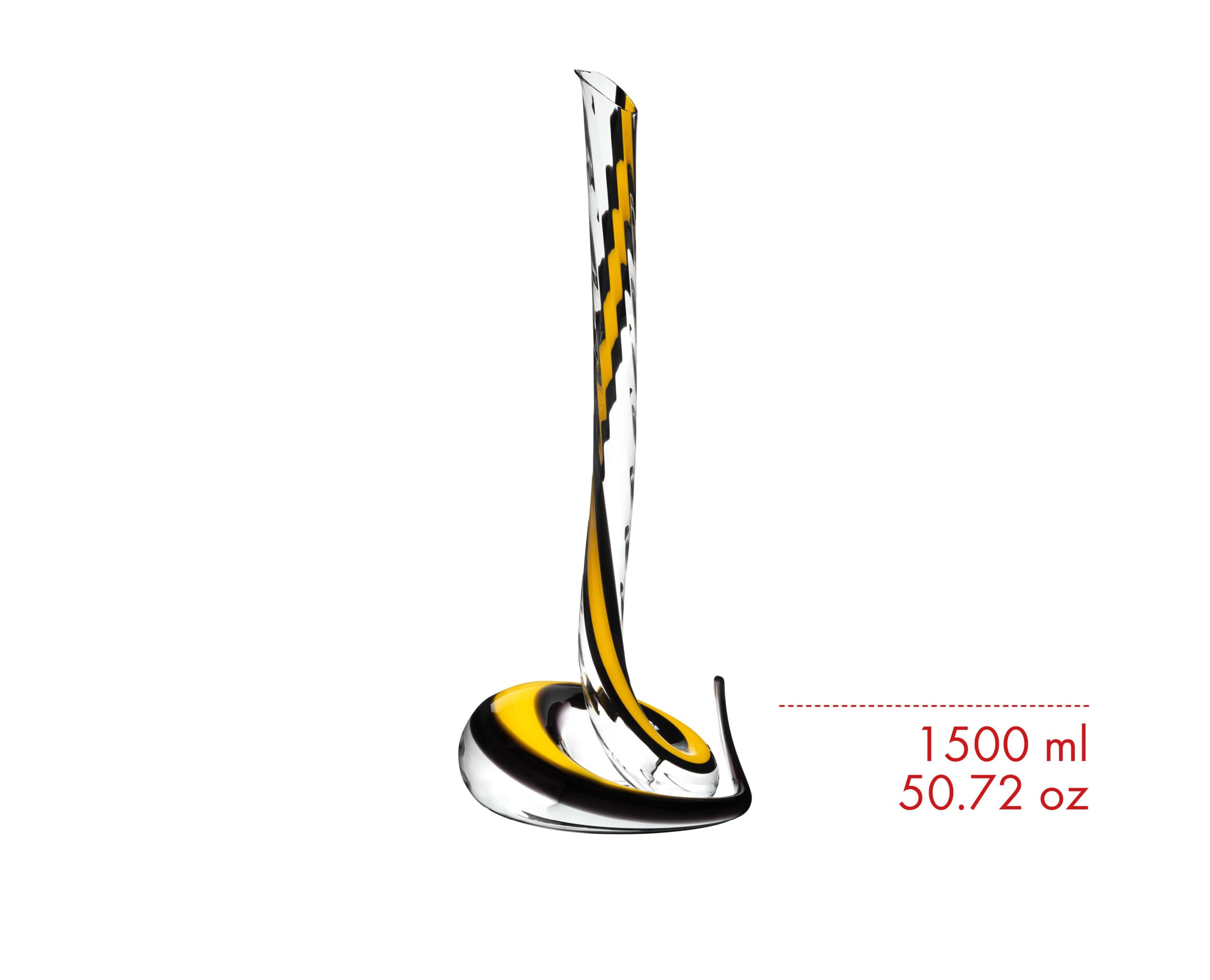 The Cobra Magnum Decanter is a striking evolution of RIEDEL’s iconic Eve, created to deliver theatrical design on a grand scale. Crafted to hold magnum-sized bottles (1.5L), it is both a functional masterpiece and a visual statement. Defined by its Yellow and Black multi-shade stripe, each Cobra Magnum Decanter is free blown by a master glass blower, making every piece unique.